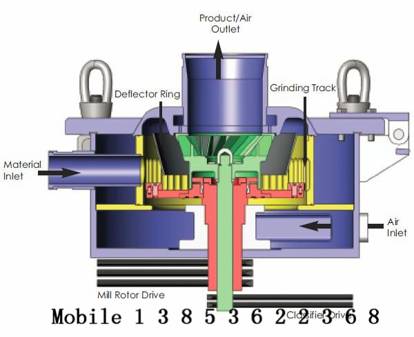 物料由加料系統(tǒng)均勻的送入粉碎室受到高速旋轉(zhuǎn)的粉碎盤的強烈沖擊,同時受到離心力的作用,與粉碎齒圈發(fā)生碰撞,受到剪切、摩擦、碰撞等多種綜合力的作用,使物料粉碎,被粉碎的物料隨氣流運動到分級區(qū),通過變頻調(diào)節(jié)的分級輪,對粗細物料進行分離,符合細度要求的產(chǎn)品隨氣流進入旋風(fēng)收集器和除塵器收集,粗物料返回分級區(qū)二次粉碎。