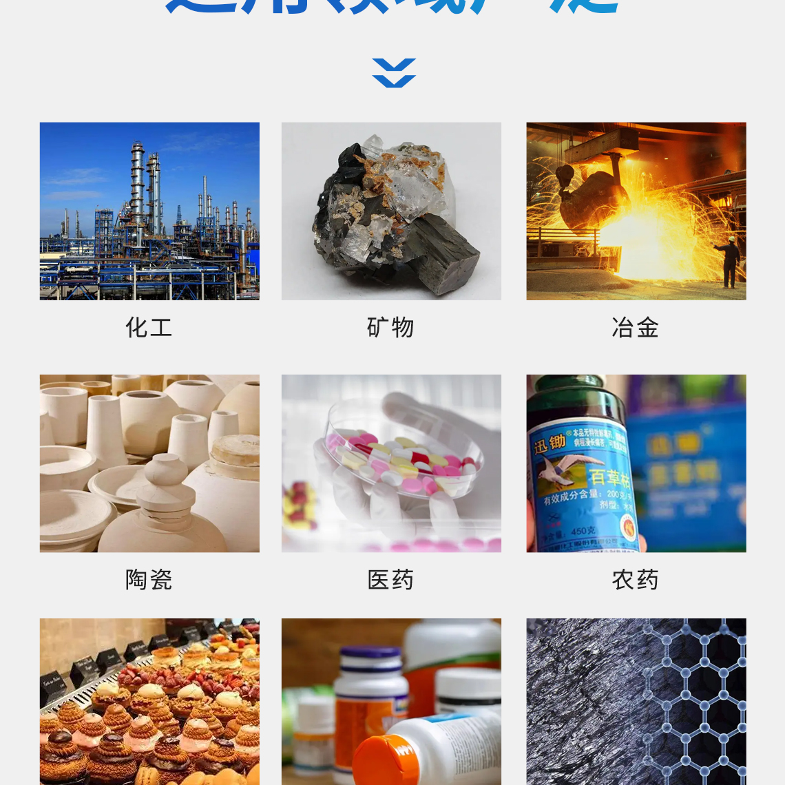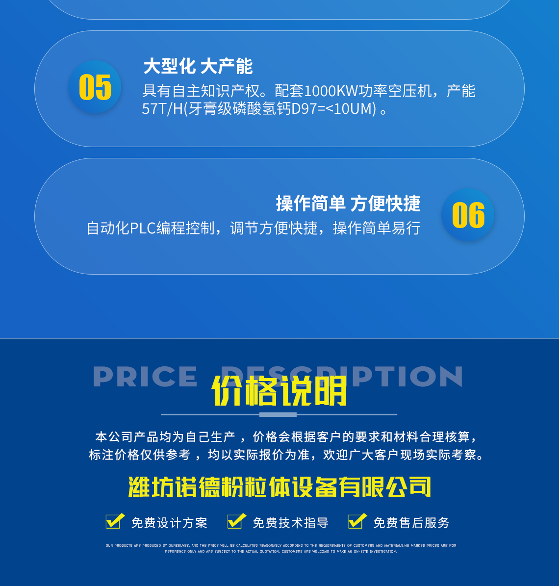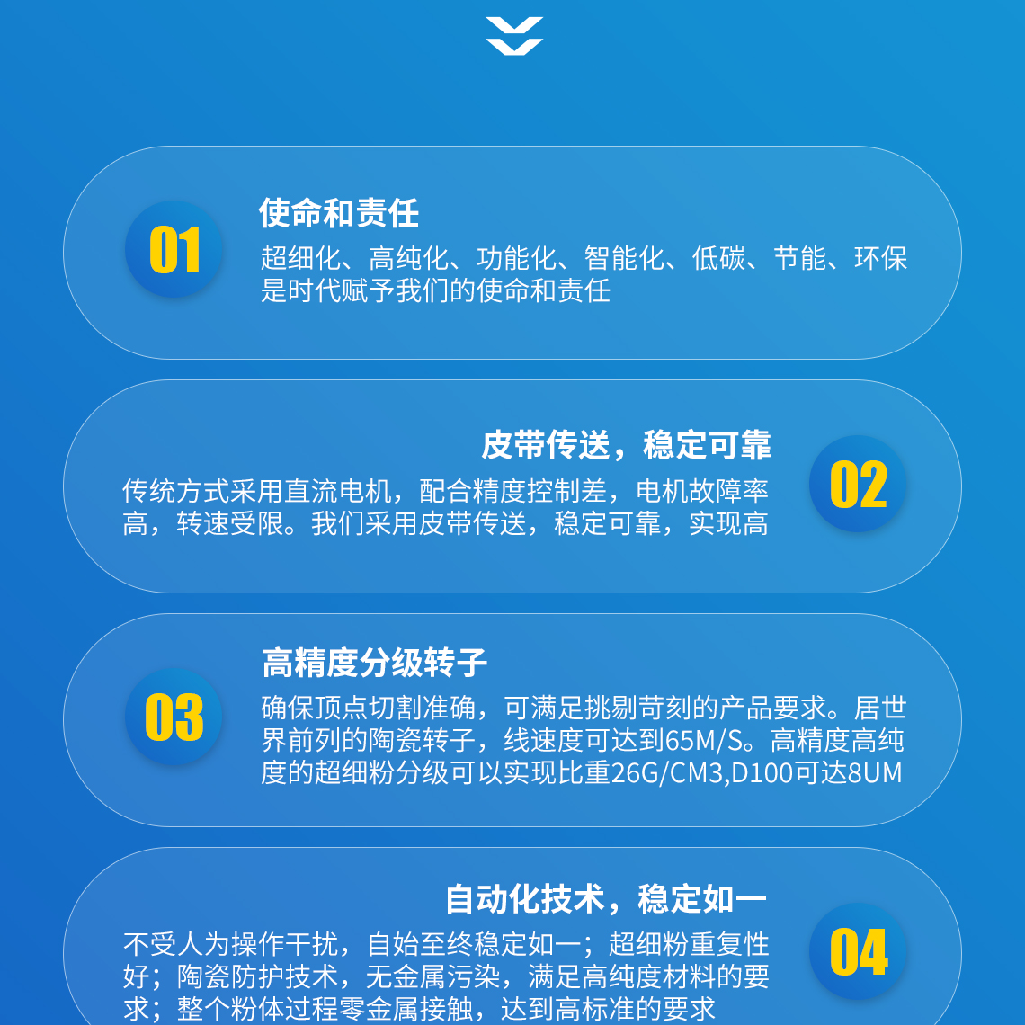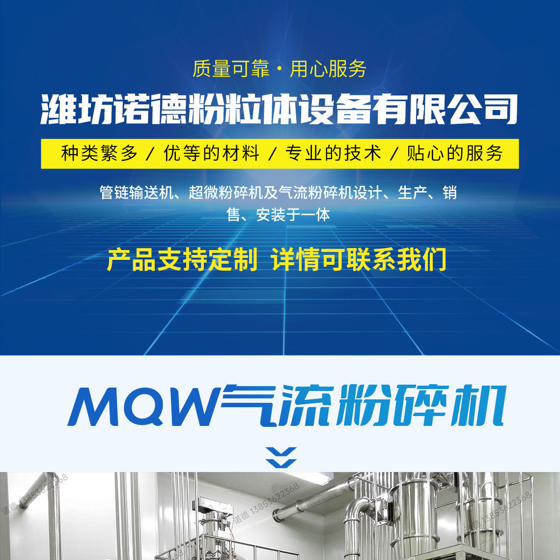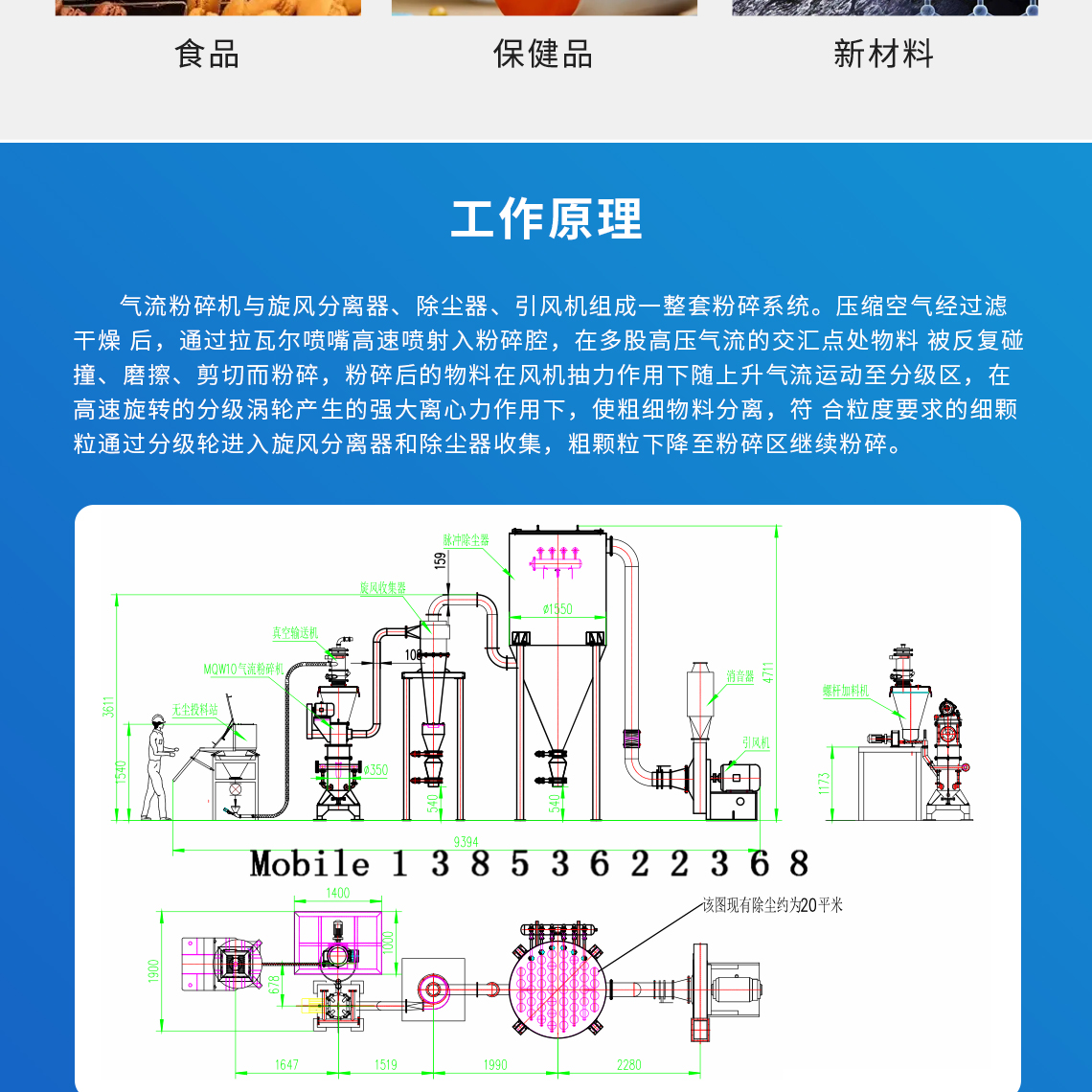 氣流粉碎機(jī)與旋風(fēng)分離器、除塵器、引風(fēng)機(jī)組成一整套粉碎系統(tǒng)。壓縮空氣經(jīng)過(guò)濾干燥后,通過(guò)拉瓦爾噴嘴高速?lài)娚淙敕鬯榍?,在多股高壓氣流的交匯點(diǎn)處物料被反復(fù)碰撞、磨擦、剪切而粉碎,粉碎后的物料在風(fēng)機(jī)抽力作用下隨上升氣流運(yùn)動(dòng)至分級(jí)區(qū),在高速旋轉(zhuǎn)的分級(jí)渦輪產(chǎn)生的強(qiáng)大離心力作用下,使粗細(xì)物料分離,符合粒度要求的細(xì)顆粒通過(guò)分級(jí)輪進(jìn)入旋風(fēng)分離器和除塵器收集,粗顆粒下降至粉碎區(qū)繼續(xù)粉碎。