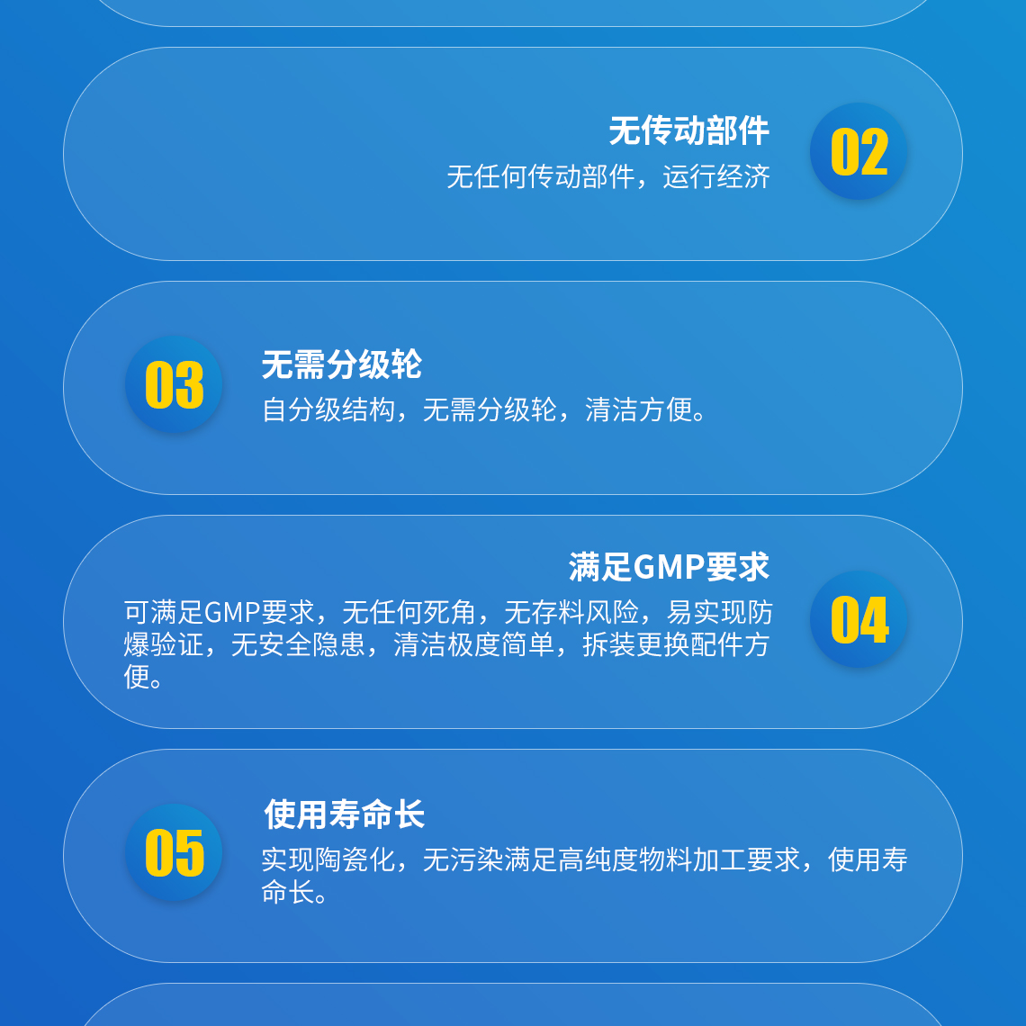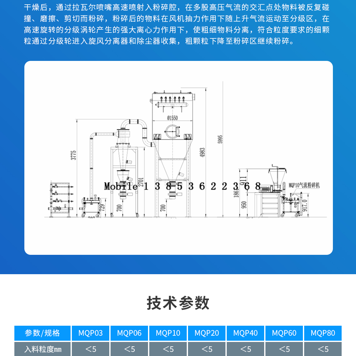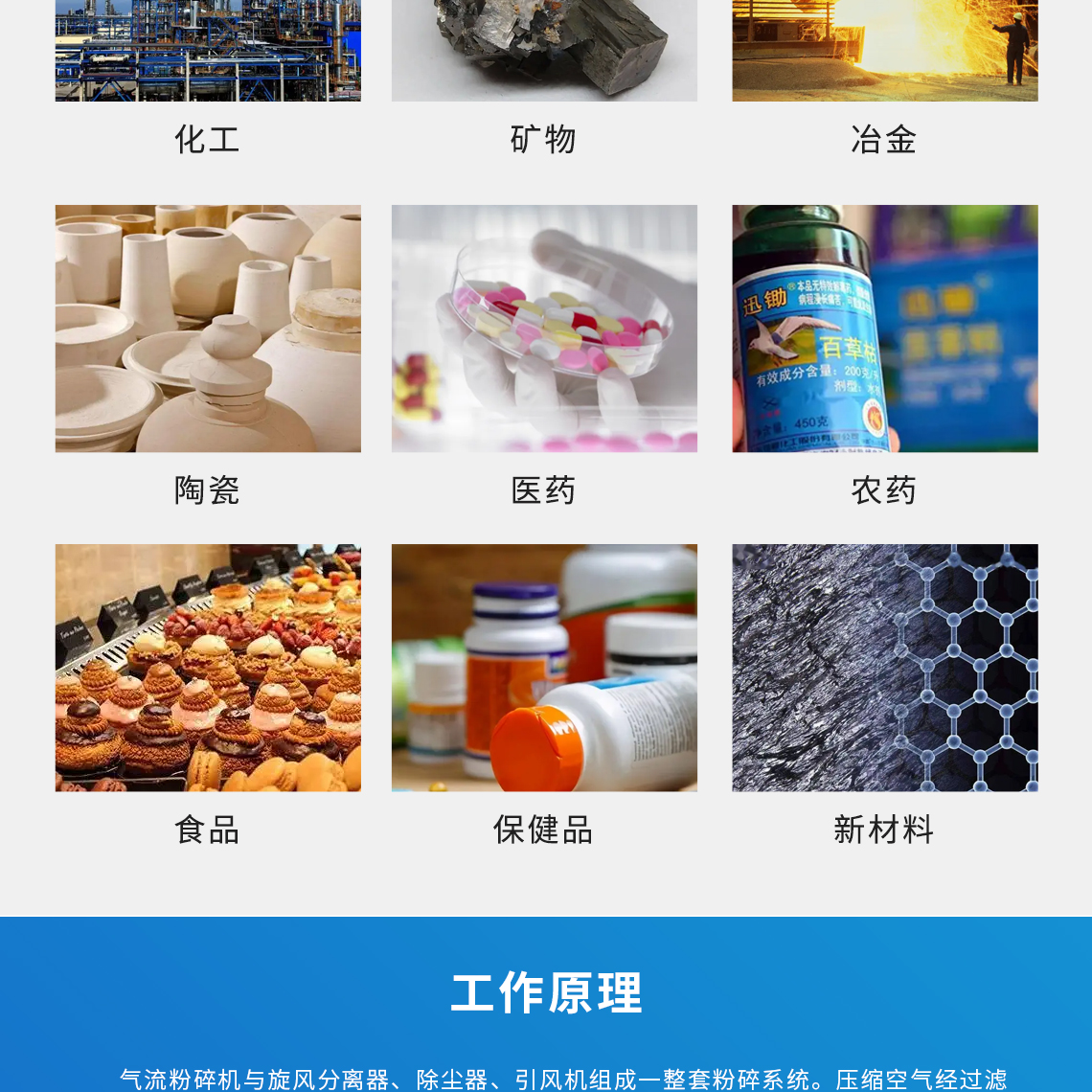 氣流粉碎機(jī)與旋風(fēng)分離器、除塵器、引風(fēng)機(jī)組成一整套粉碎系統(tǒng)。壓縮空氣經(jīng)過濾干燥后,通過拉瓦爾噴嘴高速噴射入粉碎腔,在多股高壓氣流的交匯點(diǎn)處物料被反復(fù)碰撞、磨擦、剪切而粉碎,粉碎后的物料在風(fēng)機(jī)抽力作用下隨上升氣流運(yùn)動(dòng)至分級(jí)區(qū),在高速旋轉(zhuǎn)的分級(jí)渦輪產(chǎn)生的強(qiáng)大離心力作用下,使粗細(xì)物料分離,符合粒度要求的細(xì)顆粒通過分級(jí)輪進(jìn)入旋風(fēng)分離器和除塵器收集,粗顆粒下降至粉碎區(qū)繼續(xù)粉碎。